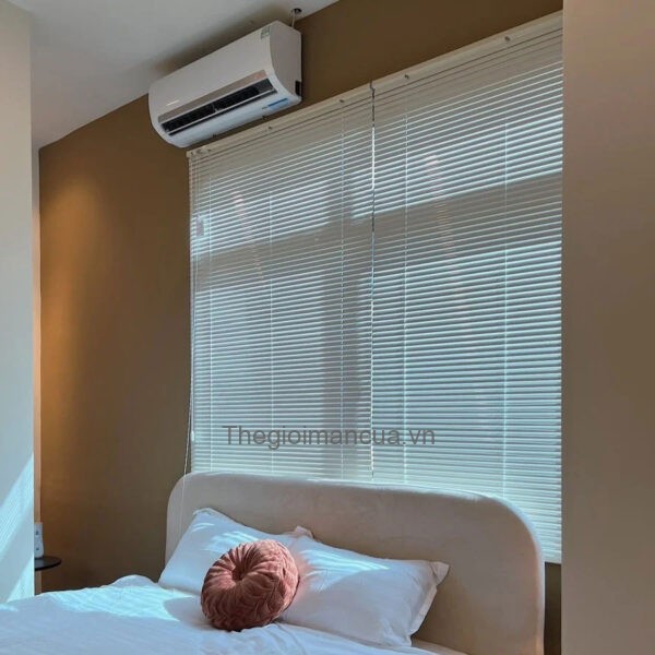 Rèm sáo nhôm phòng ngủ che nắng cửa sổ màu trắng tạo không gian riêng tư, hiện đại.